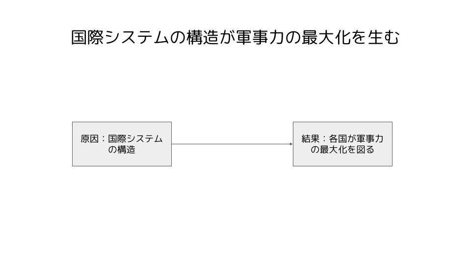 こうして、国際システムの構造が軍事力の最大化という国家の行動をもたらすのです。